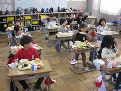 ほかの学年も給食タイム。照り焼きハンバーグのおいしさに、舌鼓を打ってしまいそうです!!
