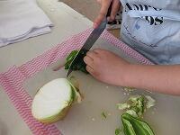 包丁の持ち方やまな板の使い方、野菜の切り方・炒め方など、担任や学校栄養士から指導を受け、悪戦苦闘のすえ、ちょっぴり苦みの感じる野菜炒めが出来上がりました興奮・ヤッター!