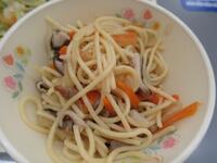 今日のきのこスパゲティには、しめじ、しいたけ、マッシュルームの三種類のきのこが使用されています。