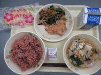 赤飯 小袋ごま塩 牛乳 塩唐揚げ ゆかり和え お祝いすまし汁 お祝いクレープ