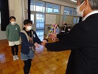 ポスターや書道、持久走大会の新記録、多読賞などの受賞者28名が会議室で校長先生から賞状やトロフィーなどをもらいました。