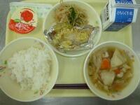 ご飯、牛乳、鮭のちゃんちゃん焼き(北海道)、おかひじきのおひたし(山形県)、せんべい汁(青森県)、りんごゼリーです。