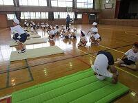 背中を丸めて小さく回ること、両手をしっかりとマットにつくこと、できるだけ後頭部をつくようにするとよいこと等、指導者が丁寧に説明をしていました。