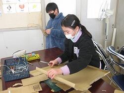 結束バンドを使って上手に段ボールを繋げたり、段ボールカッターで大きな段ボールに切り込みを入れたりするなど、分担しながら作業していました。