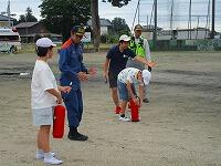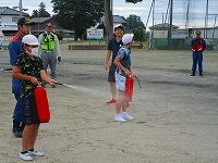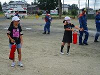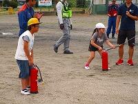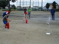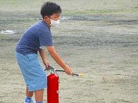 消火器の使い方を教えていただき、代表児童が放水体験をしました