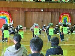 1年生が、6年生にプレゼントを渡しました。5年生がサポートしました。