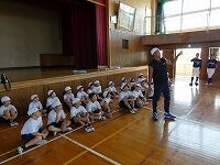 児童に投げる力を付けるため、4年生が、外部講師を招いて講習を受けました