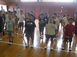 児童の並びを前後入れ替え、体育館前方は高学年、後方を低学年にして行いました