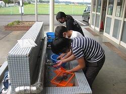 【環境委員会】亀や金魚の水槽を丁寧に洗い、水を換えていました。
