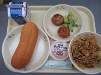 背割りコッペパン 牛乳 じゃがいも入り焼きそば 揚げにら饅頭 キムチ和え チョコプリン
