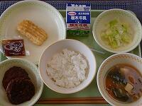 <今日の給食> ご飯・牛乳・きのこソースハンバーグ・干瓢のごま醤油和え・野菜スープ