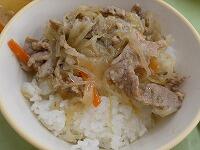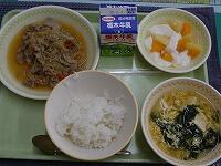 <今日の給食> ご判(しょうゆ糀の焼き肉丼)・牛乳・しょうゆ糀の焼き肉丼の具・卵とわかめのスープ・フルーツ杏仁