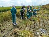 5年生が、9月11日(月)の9:30から約2時間をかけて、学校の南側の田んぼの稲刈りを行いました。田植えをした後は、「あらい水と緑の会」の皆様に管理をしていただいてきましたが、時々下校前にみんなで様子を観察しながら、稲刈りを楽しみに待っていました。初めての作業で最初は難しそうにしていた子どもたちも、稲刈りがまを使って稲の根元から上手に刈り取り、いくつかの束にしてまとめ、田んぼの中にかさがけにしました。みんな汗をびっしょりかきながら、満足そうに自分たちで刈り取った後の田んぼとかさがげした稲を見る様子が印象的でした。前回5月18日の田植えに引き続きお世話になりました「あらい水と緑の会」と「JAしもつけ」の皆様、大変ありがとうございました。お陰様で貴重な体験となりました。