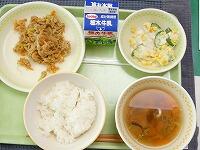 <今日の給食>【生きゅうり献立】ご飯・牛乳・豚肉のスタミナ炒め・やみつききゅうり・中華風卵スープ
