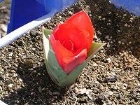 <学校の生き物たち紹介> 校舎南側に並べられている2年生の植木鉢の一つに、春の訪れを待っていたかのように、深紅のチューリップが一輪咲き始めました。