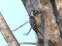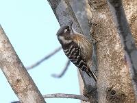 <学校の生き物たち紹介> 朝、校長室前のトチノキで、ドラミングをしながら餌探しをしているコゲラに出会いました。