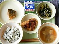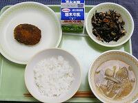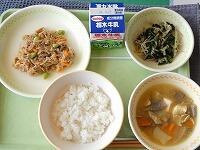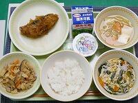 <今日の給食>【西小リクエスト献立】わかめご飯・牛乳・さばの味噌煮・磯香和え・味噌けんちん汁