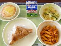 <今日の給食> 手作りアップルパイ・牛乳・ペンネのボロネーゼ・こんにゃくサラダ