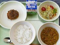 <今日の給食>【生カクテルトマト献立】ご飯(キーマカレー)・牛乳・キーマカレー・チキンのメンチカツ・カクテルトマトのイタリアンサラダ