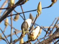 <学校の生き物たち紹介> 正門の北側脇や北校庭のフェンス沿いに生えているハクモクレンのつぼみが開き始めています。