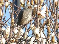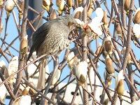<学校の生き物たち紹介> 正門付近のハクモクレンで、ヒヨドリが花の付け根を突いて、何かを口にしている様子が見られました。
