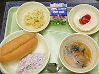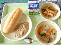 <今日の給食> コッペパン(ツナサンド)・牛乳・ツナサンドの具・フレンチポテト・ワンタンスープ