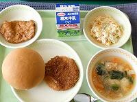 <今年度最後の給食> 丸パン(ハムカツサンド)・牛乳・ハムカツサンドの具・コールスローサラダ・手作り肉団子スープ