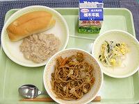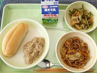 <今日の給食> ミニコッペパン(ツナサンド)・牛乳・ツナサンドの具・焼きそば・ほうれん草とコーンのサラダ