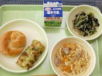 <今日の給食> 栃木市産米粉パン・牛乳・煮込みうどん・かぼちゃコロッケ・辛子和え