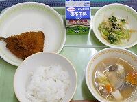 <今日の給食>【西小リクエスト献立】筍ご飯・牛乳・豚肉の生姜焼き・ブロッコリーのごま和え・キャベツのスープ