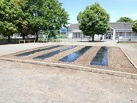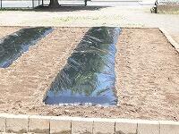 学校技能員さんが土おこしをしておいた畑に、籾殻を撒いて混ぜながら畝を作り、マルチを掛けて完成しました。
