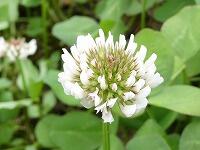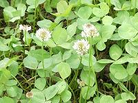 <学校の生き物たち紹介> 校舎北側の教材園の周辺で、シロツメクサが白い花を咲かせています。