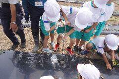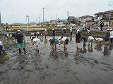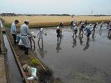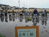 5月23日(木)の2校時から3校時にかけて、学校の南側にある田をお借りして、5年生が田植え学習を行いました。今年も、あらい水と緑の会の皆様、JAしもつけの皆様、育成会の皆様のご指導とご協力を得て、貴重な体験をさせていただきました。初めて体験する児童が多く、わくわくどきどきしながら、田に足を踏み入れ、教えていただいたように稲の苗を3、4本つまんで植え始めました。しだいにコツをつかんで、約1時間ですべて植えつけることができました。貴重な体験の場と機会を与えていただきました関係者の皆様、大変ありがとうございました。