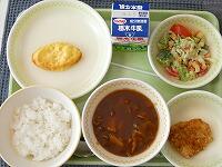 <今日の給食>【生カクテルトマト献立】ご飯(ハヤシライス)・牛乳・ハヤシライスの具・オムレツ・シーザーサラダ
