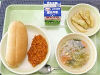 <今日の給食> コッペパン(ミートサンド)・牛乳・ミートサンドの具・フライドポテト・ABCマカロニスープ