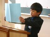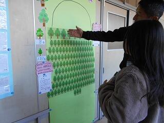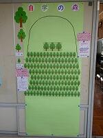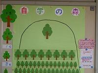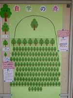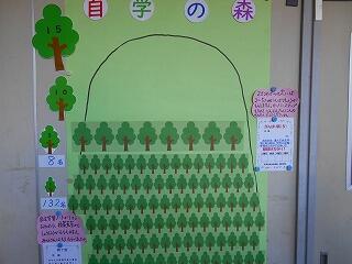 宿題以外に自分で課題を決めて自主学習に取り組んでいる児童が増えています。自主学習ノートが1冊終わると、校長から校長室で終了証が授与されます。さらに2冊目からは、がんばり賞(5)、(10)、(15)を目指して、継続して5冊、10冊、15冊目に挑戦しています。会議室の前には、自学の森の掲示物を用意し、1冊、5冊、10冊、15冊と冊数に応じて、だんだん大きくなる木が貼り出されています。12月18日現在で、1冊終了者は132名います。これからも自学の森が大きくなっていくことを期待しています。