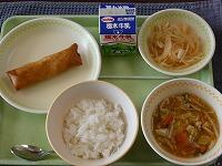 <今日の給食>【生カクテルトマト献立】ご飯(中華丼)・牛乳・中華丼の具・春巻き・生カクテルトマトの中華ごまドレサラダ