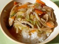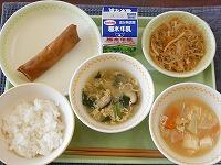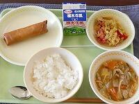 <今日の給食> ご飯(中華丼)・牛乳・中華丼の具・春巻き・キムチ和え