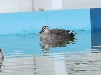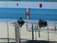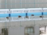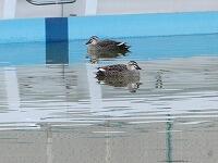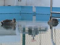 <学校の生き物たち紹介> 朝の校庭巡回中、プールで羽を休めるカルガモの番に出会いました。