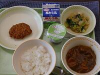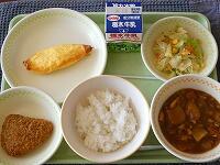 <今日の給食>【中央小リクエスト献立】ご飯(カツカレー)・牛乳・野菜カレー・ヒレカツ・ごま和え・ぶどうゼリー