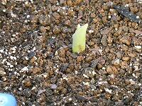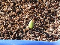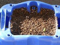 <学校の生き物たち紹介> 寒空の下、2年生がチューリップの球根を植えた鉢に、ちょこっと顔を出したかわいらしい芽を見付けました。