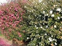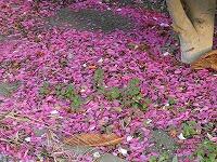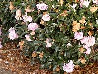 <学校の生き物たち紹介> 校舎北側のフェンス沿いで、サザンカが次から次への花を咲かせては花びらを散らし、根元を白やピンクに彩っています。