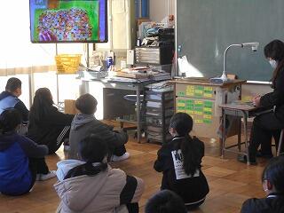 2月7日(水)の朝の活動の時間に、1~3年生対象に読み聞かせが行われました。1年3組では『なまけもの』という本の読み聞かせでした。児童は、大画面TVに映し出された絵本を見ながら、お話を楽しそうに聞いていました。読み聞かせボランティアの皆様、寒い中、本日も素敵な読み聞かせをありがとうございました。