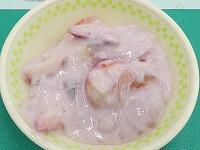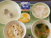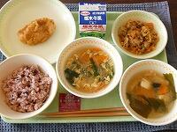 <今日の給食>【初午献立】赤飯・ごま塩・牛乳・鶏の唐揚げレモンソースがけ・しもつかれ・にら玉汁