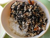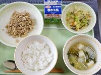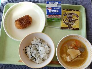 <今日の給食> ご飯・手作りじゃこふりかけ・牛乳・磯香和え・じゃが芋のそぼろ煮