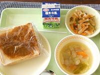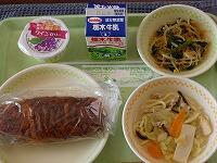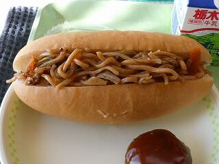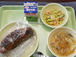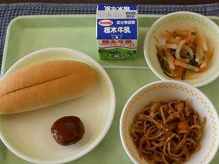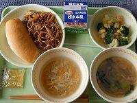 <今日の給食> ミニコッペパン・りんごジャム・牛乳・焼きそば・花野菜サラダ・卵とエノキのスープ