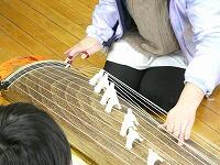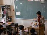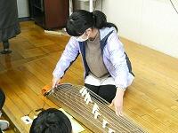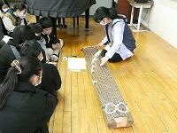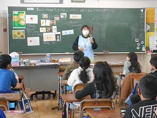 6年音楽の授業の中で、日本の伝統楽器の一つである「箏」の学習が行われ、指導者である担任が、専門性を生かして演奏を披露していました。