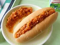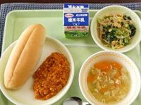 <今日の給食> コッペパン(ミートサンド)・牛乳・ミートサンドの具・野菜のごまドレサラダ・ABCマカロニスープ