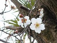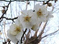 <学校の生き物たち紹介> 校庭南西角の雑木園では、ウメが白い可憐な花を咲かせています。