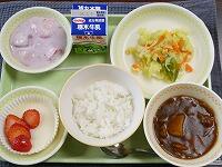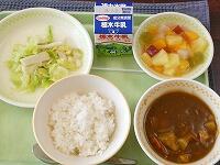 <今日の給食> 麦ご飯(カレーライス)・牛乳・チキンカレー・キャベツとかまぼこのソテー・フルーツポンチ